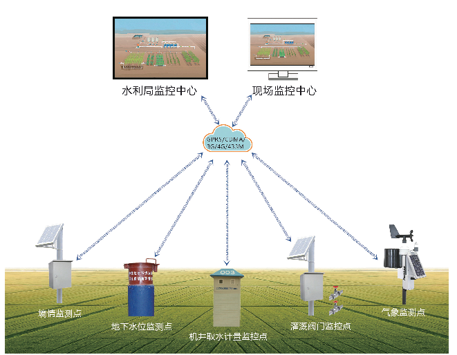 節水增糧信息化監控系統基于機井取水計量監控、地下水位監測、土壤墑情監測、田間氣象監測、灌溉自動控制等系統進行多功能設計,采用GPRS/CDMA或433MHZ的無線通信方式,實現監控中心對多測點的遠程監控,為農田水利管理和水資源監管提供了可靠的技術保障。